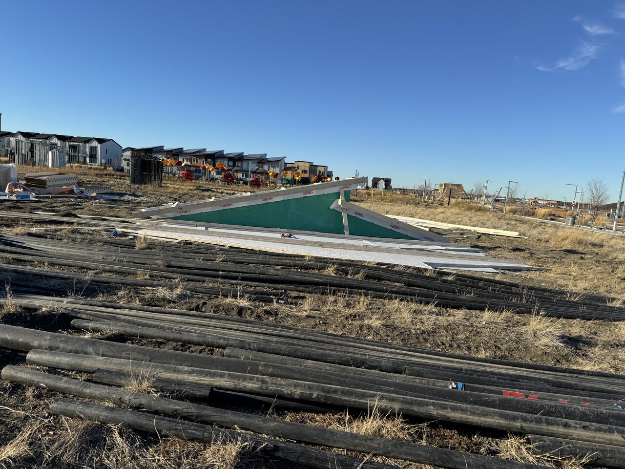 So Stratosphere's Pilot development has its first row almost framed. It seemed to go up in a hurry, probably because they're bringing in modular components. Meanwhile, they've also been building out foundations, to the point of having several more rows in various stages of completion.