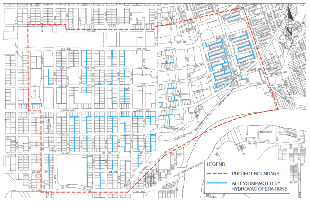 "Hydrovac operations will start this week to expose utilities throughout alleys in the Downtown Business Improvement Area (BIA) area. Hydrovac is required for concept planning and design. The work will be scheduled during weekdays and will impact alley access for a few hours at a time. Full alley closures are currently not anticipated. The hydrovac operations will be carried out in stages, and impacted businesses and properties will be notified through letters and posters prior to work commencing. This work is planned for completion in the spring."