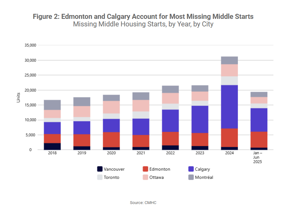 "Edmonton and Calgary lead the way in Missing Middle housing starts, supported by a lower regulatory burden, abundant land availability and favourable policy environments. Meanwhile, Toronto and Vancouver lag where denser forms of housing have historically been more feasible."