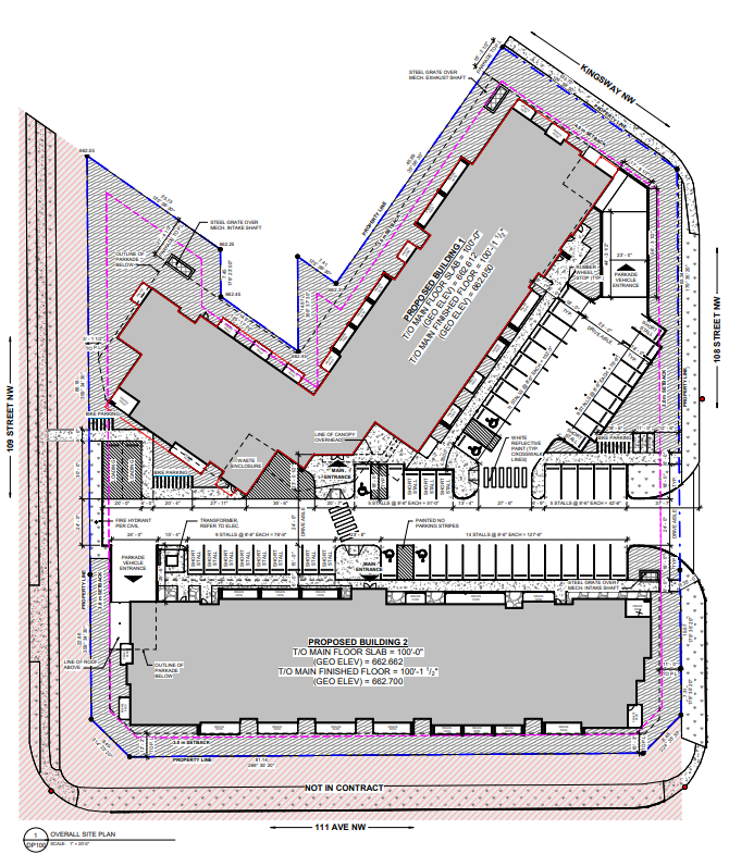 I wish the Edmonton Design Commitee had jurisdiction in the Kingsway area (it ends at 111 Avenue).Ugh so many things wrong with this. The buildings are too wide, there’s parking on the ground level, nothings orientated towards 109 Street, the building on 111 Ave should be taller to provide a street wall on a wide thoroughfare. I hope this goes back to the drawing board. This area of town really needs to urbanize and this is not the way to do it. This looks like a project that belongs on James Mowatt Trail.