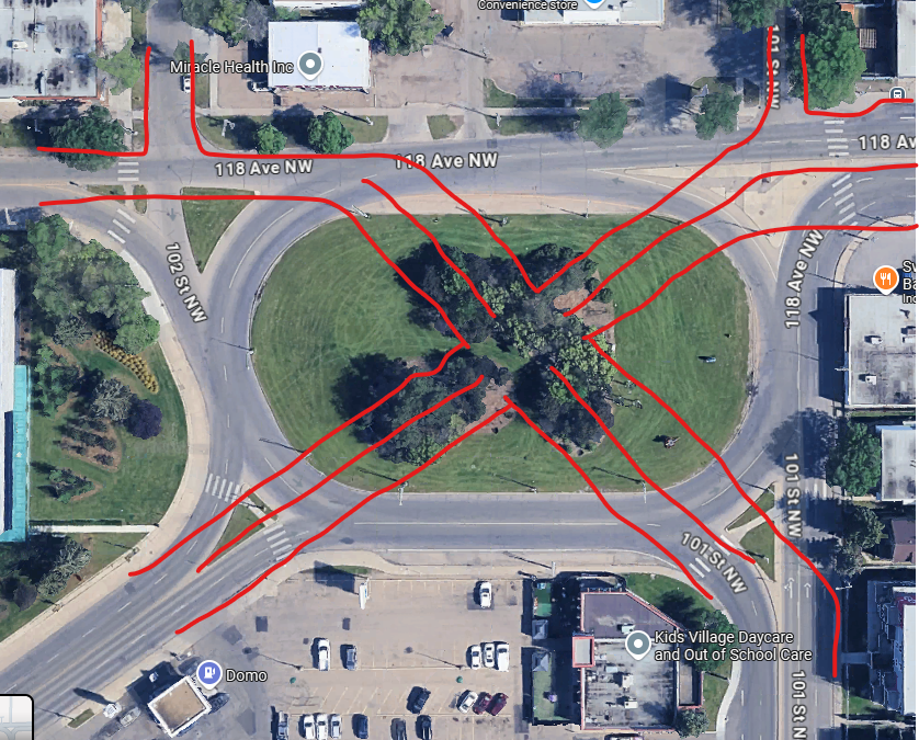 On the topic of roundabouts, I think the city should go all-in on installing these along 111 avenue. Add roundabouts at 124th Street, Groat Road, 142 st, 149 st and 156 st! Add another at Mayfield road & 107 Ave for good measure!