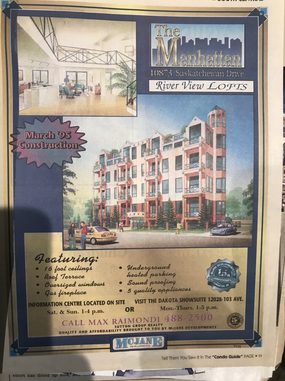 That must have been a very early ad, for if you look at the image this is not reflective of what was built; I recall a sign that had 299-315k or something of that nature.There was some very brief discussion a couple weeks ago on the Manhattan condo building on Sask Drive. I dug through my “archives” and found this. It is an ad from the old monthly Condo Guide magazine. Not sure which month or year but my guess is sometime in 1994. The ad says March 1995 construction. The article states that the prices range from $83,600 to $187,000.