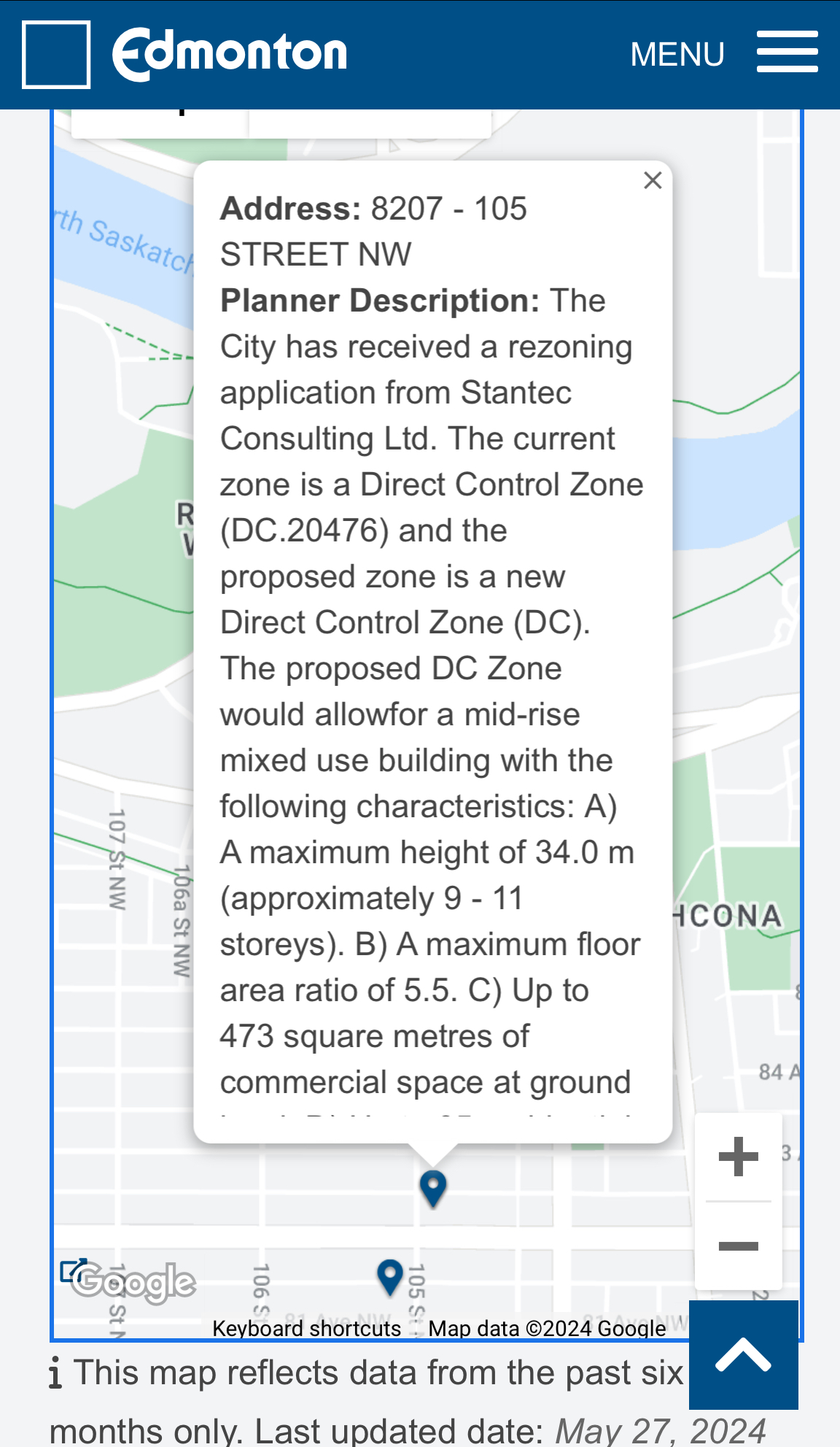 Planner Description: The City has received a rezoning application from Stantec Consulting Ltd. The current zone is a Direct Control Zone (DC.20476) and the proposed zone is a new Direct Control Zone (DC). The proposed DC Zone would allowfor a mid-rise mixed use building with the following characteristics: A) A maximum height of 34.0 m (approximately 9 - 11 storeys). B) A maximum floor area ratio of 5.5. C) Up to 473 square metres of commercial space at ground level. D) Up to 65 residential dwellings.