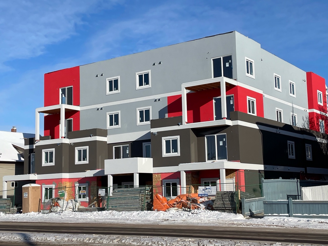 The new apartment building at the traffic circle at 118 avenue and 101 street has revealed its colours