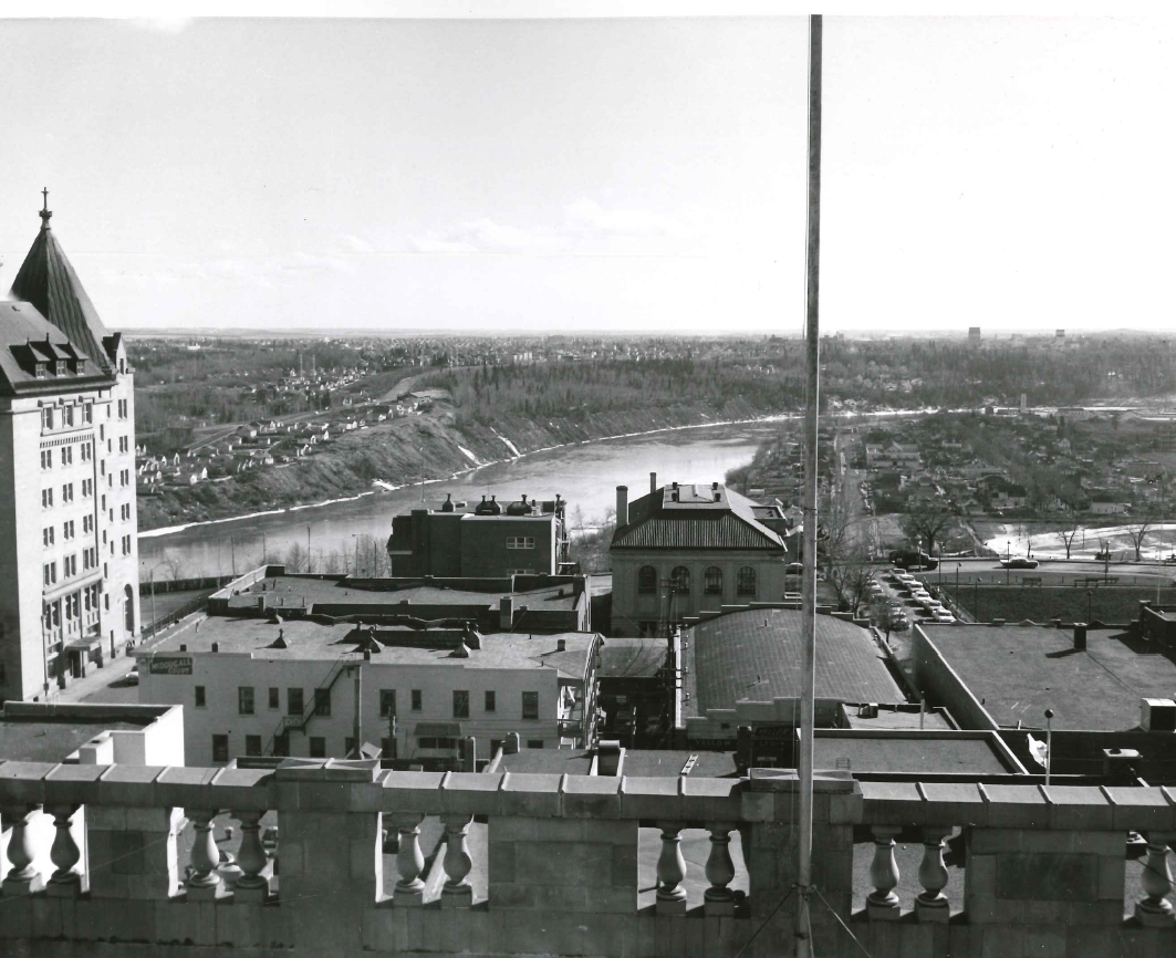 - Picture four is looking northeast. The classical building partially visible in the bottom/centre left is the original downtown Post Office, site of today's Westin Hotel. The still standing Imperial Bank of Canada building, located at 9990 Jasper Avenue, is barley visible on the far right, which would place this group of pictures around 1954-55.