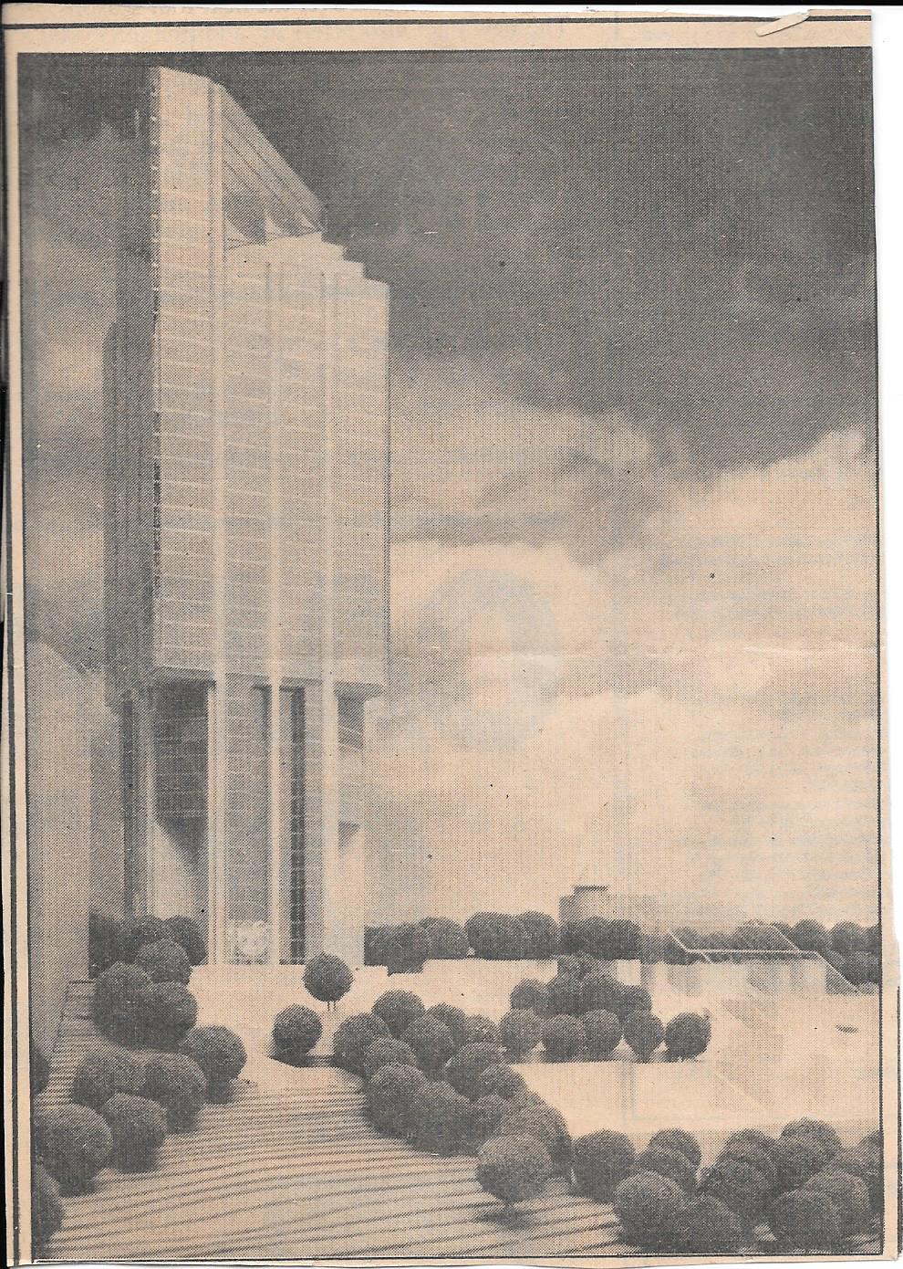 And finally, perhaps the saddest of the mid-century unbuilts, especially for a Modernism lover like myself. This was to be the completed plan for the Edmonton Public School Board's new Administration Building on the northeast corner of 101st Street and 107A Avenue. All that stands today is the two storey podium. Any University students or alumni will immediately see a striking resemblance to the Students Union Building on campus — fitting given it was designed by the same firm, Richards, Berretti & Jelinek, at basically the same time.