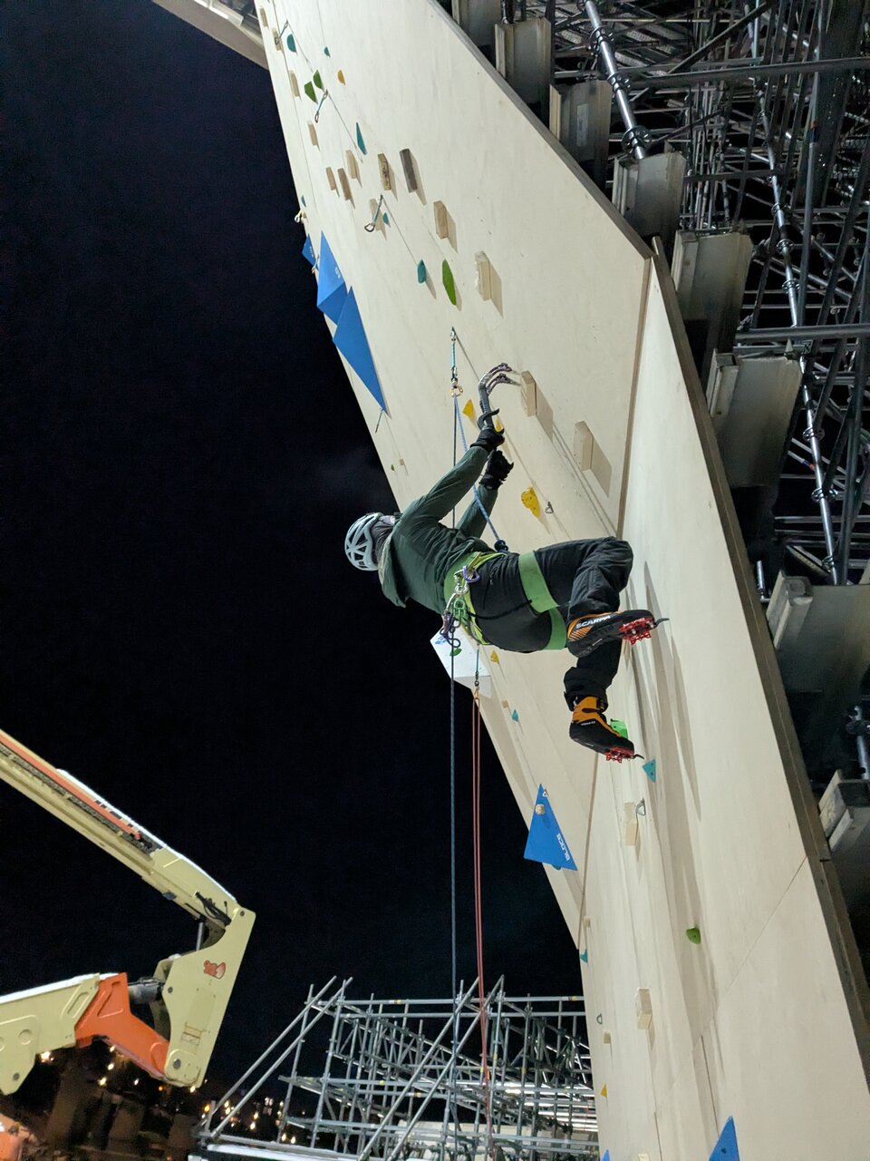 Super valid question. Competition Ice Climbing still uses Ice Tools and Crampons. The tools are hooked onto various hold that are similar to but different from rock climbing holds, and the feet kicked into the plywood, kinda like you would kick into ice. I think this picture I took during the wall setup best shows what is used. The 2x4 holds aren't used in competition because they are too easy.